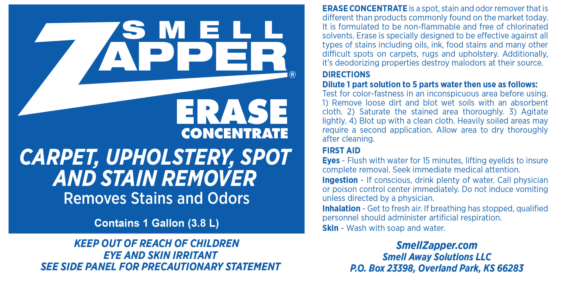 ERASE is a spot, stain remover that is different than products commonly found on the market today. It is free of chlorinated solvents. ERASE is specially designed to be effective against all types of stains including oils, ink, food stains and many other difficult spots on carpets, rugs and upholstery. Additionally, it’s deodorizing properties destroy malodors at their source.